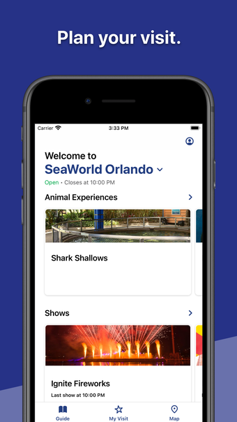 The SeaWorld App을 사용하면 Quick Queue®, All Day Dining Deal 또는 공연용 예약 좌석으로 인파크 경험을 업그레이드할 수 있습니다. 이 앱은 다른 공원으로 이동할 때 위치를 변경할 수 있도록 해주며 대화식 지도에 액세스하여 현재 위치와 인근 관광 명소를 확인할 수 있습니다. 또한 동물 체험, 공연 및 놀이기구를 포함한 관심 지점을 유형별로 필터링하여 공원 안내를 찾을 수 있습니다.